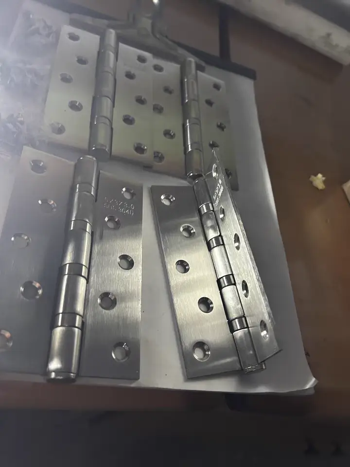 SS hinges. Burr free. Well finished. For an outside fence door. As pictured. Quiet and smooth.
